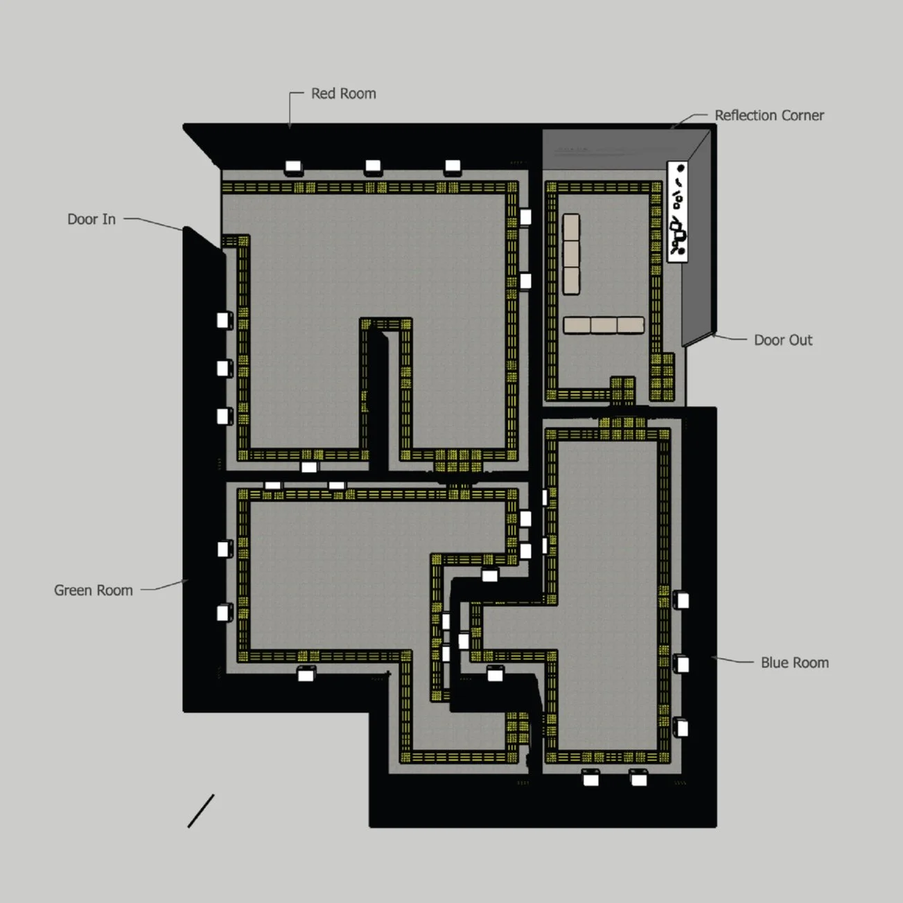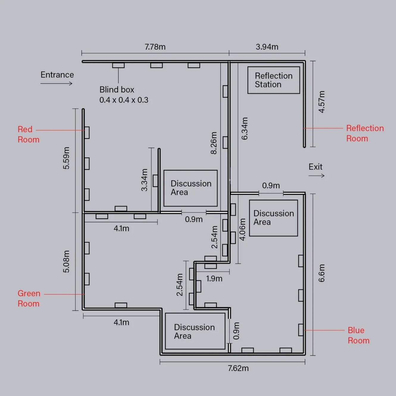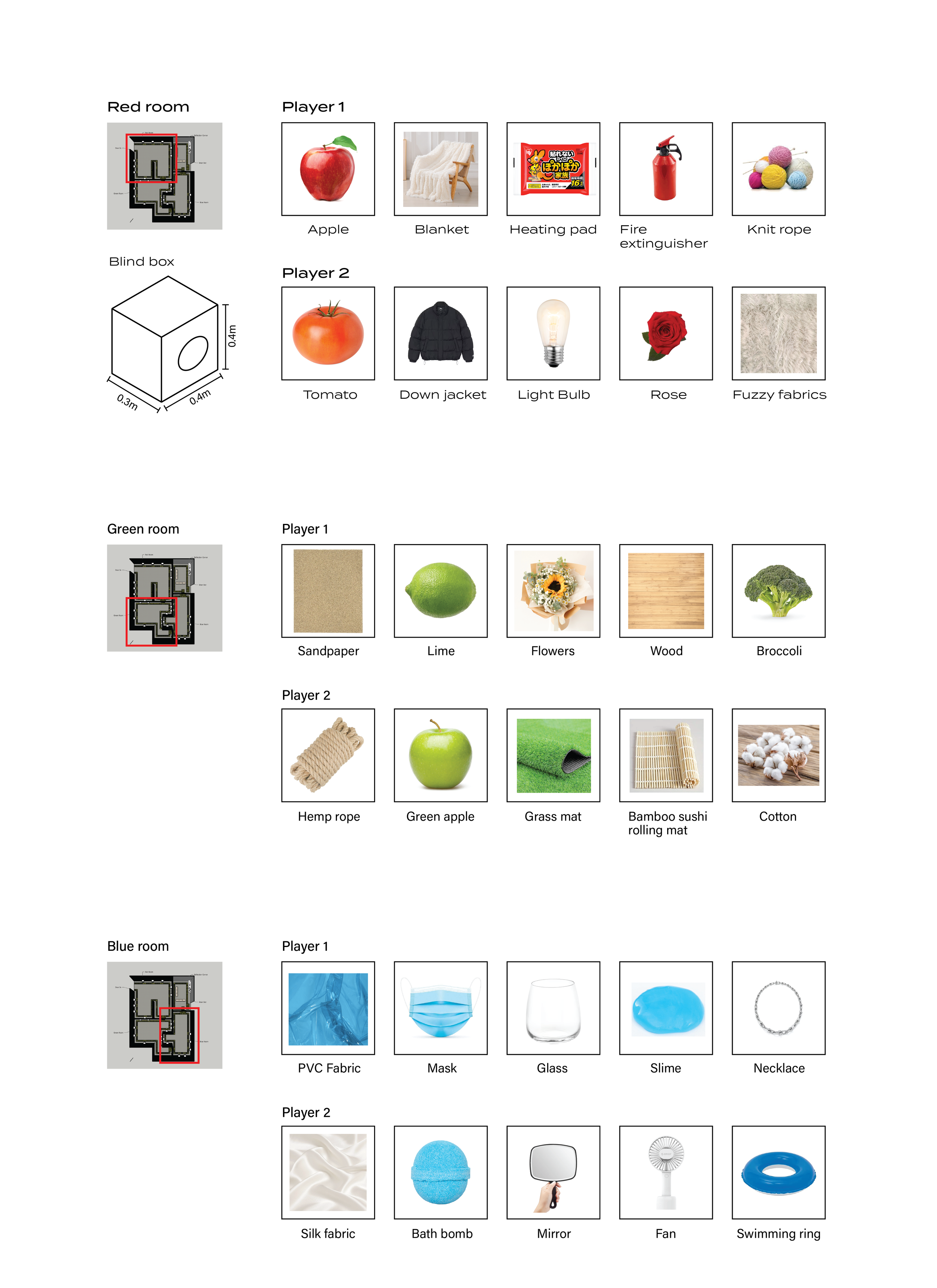In this game, there will be three sections of colors. Two players will split up and touch objects in the blind box, then discuss together and guess what color the room represents. As a partner, the final goal is to escape from the room by giving the correct answer. At the end, there will be a reflection area where players can write their reflection or discuss with their partners about this particular experience.
