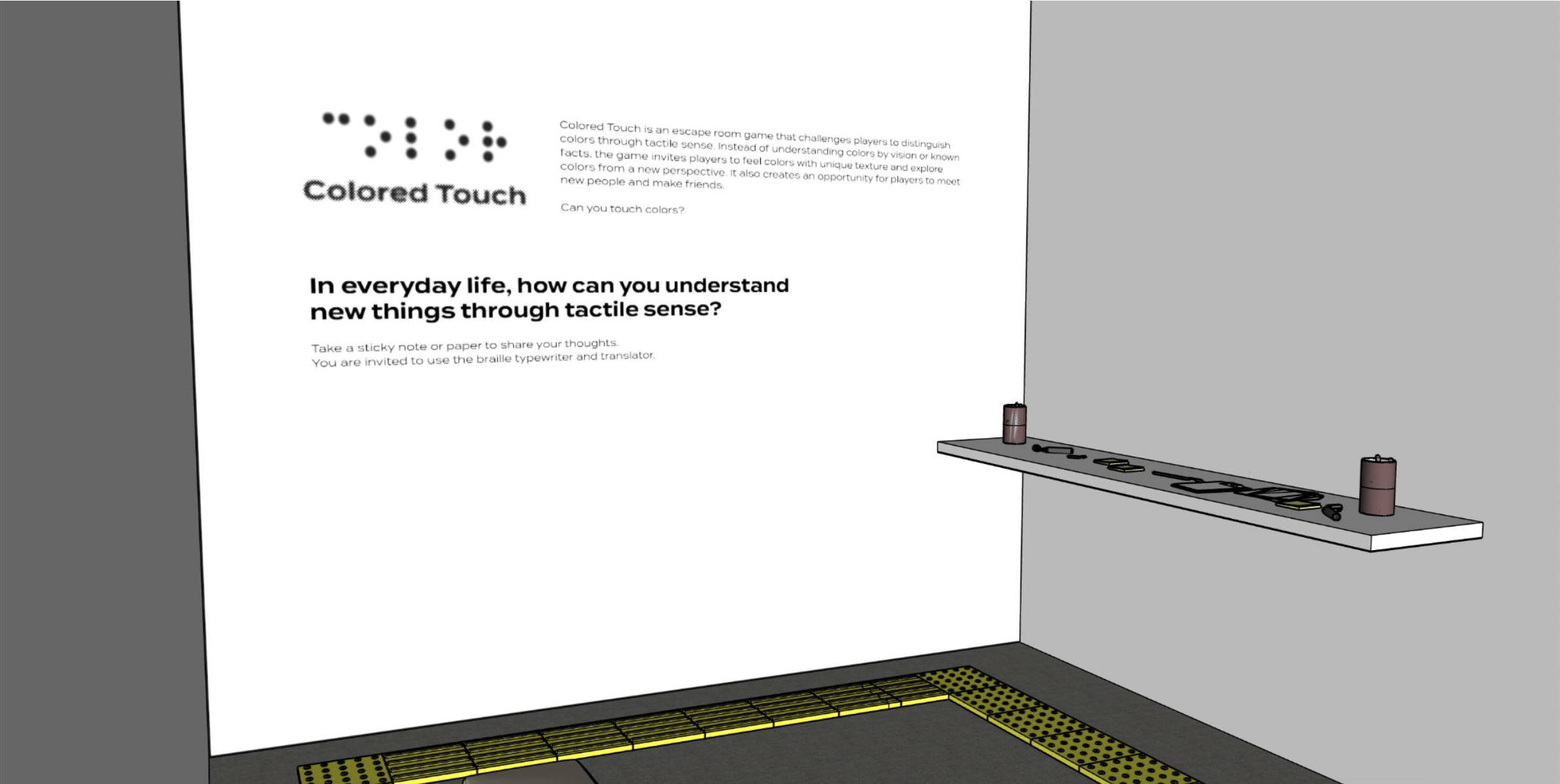 Coloured Touch is an exhibition especially targeted visually impaired people. It is an escape room game that challenges players to distinguish colours through tactile sense. Instead of understanding colors by vision or known facts, the game invites players to feel colors with unique texture and explore colors from a new perspective. It also creates an opportunity for players to meet new people and make friends.
